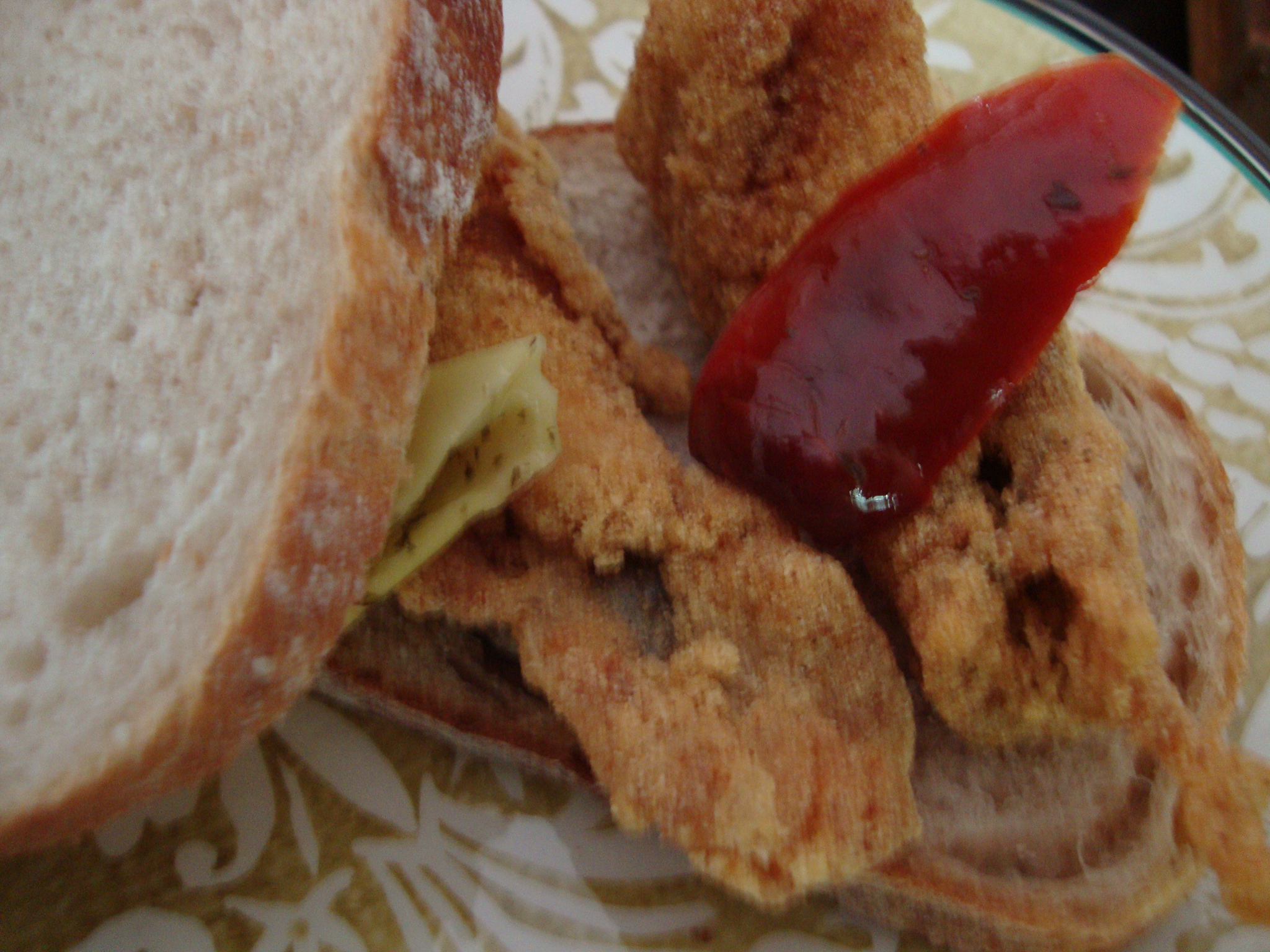 Doesn’t get any better than fillet catfish chunks on fresh bruschetta bread. Add a squeeze of lemon, red/green peppers and tartar sauce and life is wonderful. This makes a heavenly sandwich. Make sure the catfish is fried light and crispy. Serve with salad greens and baby cukes with a spritz of balsamic vinegar after you’ve thrown a bit of olive oil in the bowl’s bottom.