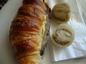 This is one sexy sandwich. A flaky light croissant joined with slices of  tenderly cooked brisket, melted horseradish cheese and a thin spread of dijon makes quite a statement. Brisket, one of the eight beef primal cuts, is muscle meat and should be cooked slowly and kept moist for tender sandwich eating. Brisket contains a lot of fat which helps to keep it from drying out during cooking. Slice thin strips and remove the fat. Layer a slice of horseradish cheese over the brisket and place under the broiler for two minutes. Horseradish cheese gives the sandwich punch along with the right mustard. Have you tried green tomato pickles? Wonderful flavor to complement this sandwich. Slice them and serve them atop of the sandwich or on the side.